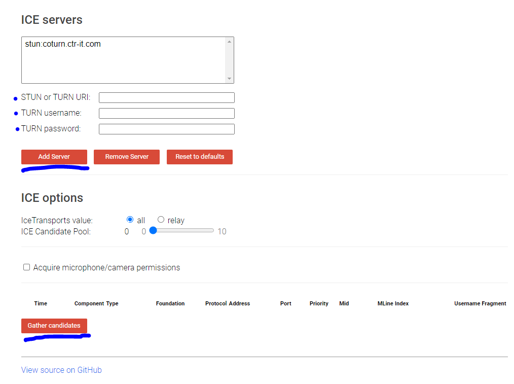 (2)TURN username/password : turnserver.conf 에서 설정한 ID와 Password를 입력.