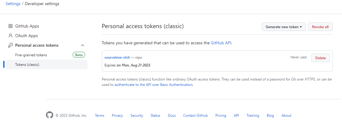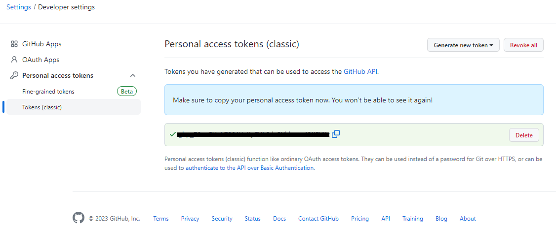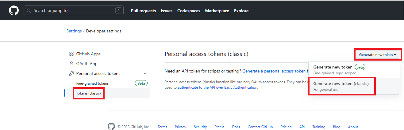 Personal access tokens → Tokens(classic) → Generate new token → Generate new token(classic)