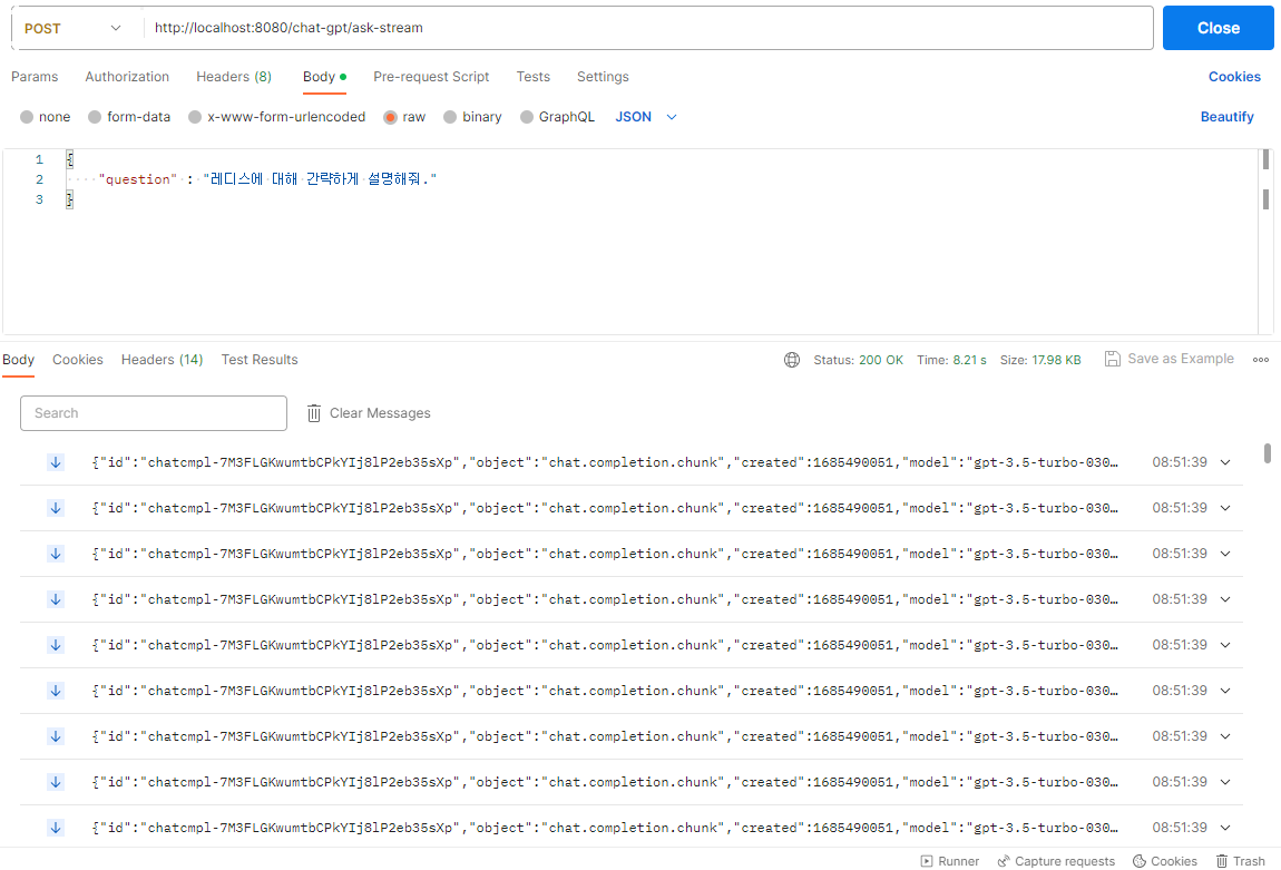 시키려면 Stream Parameter에 True값을 셋팅해 요청하면 됩니다. (False일 때는 완성된 답변을 반환합니다.)