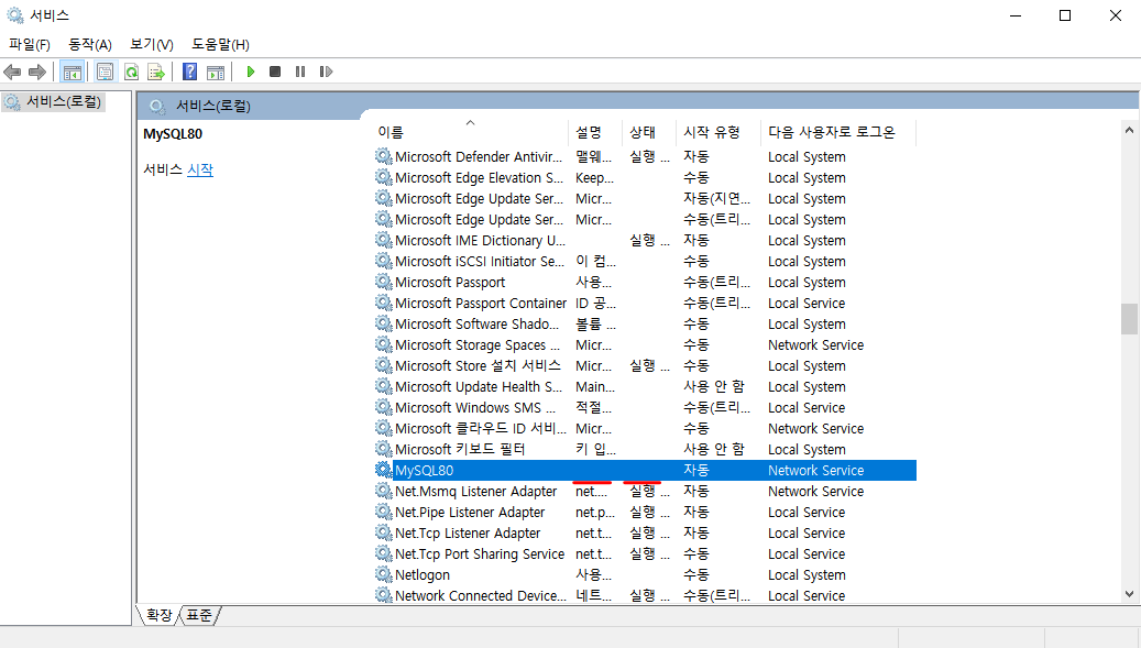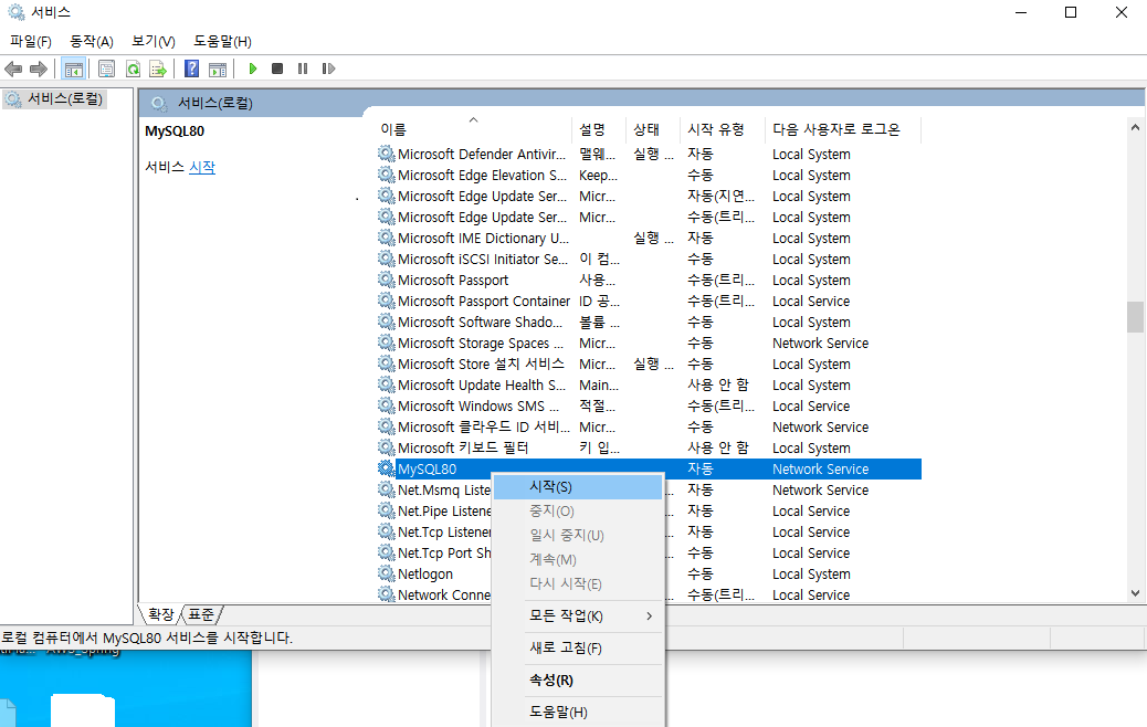 2. 서비스창에서 MySQL의 설명, 상태가 공백이다. → MySQL80을 오른쪽 클릭하여 시작을 누른다.